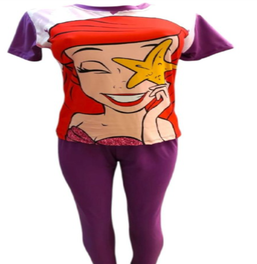 Disfruta de tus noches con estilo y comodidad con este encantador pijama de caricatura inspirado en Ariel, la Sirenita. La blusa de manga corta luce un estampado alegre y colorido con diseño frontal de la princesa, aportando un toque divertido y juvenil. Está acompañada de un pantalón tipo leggins en color morado, suave y flexible, que se adapta perfectamente para ofrecerte libertad de movimiento y confort durante el descanso.